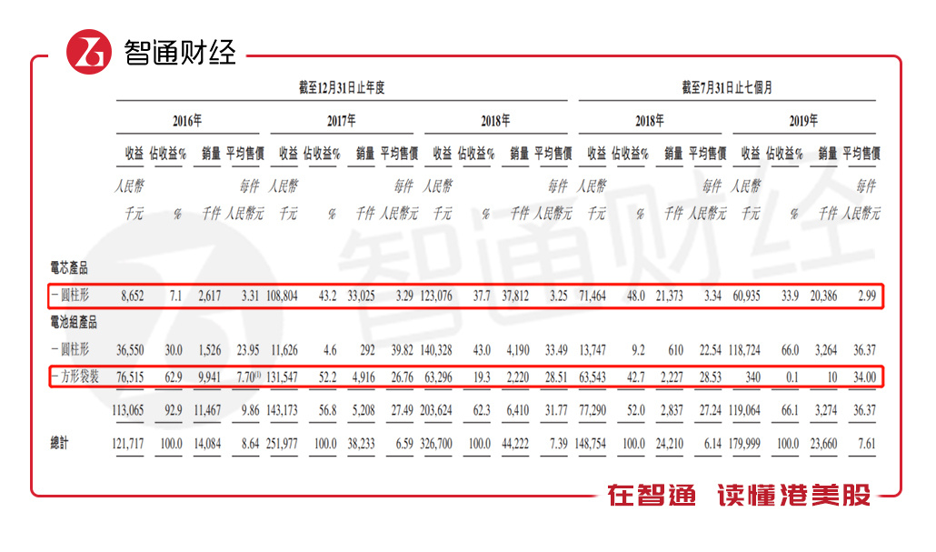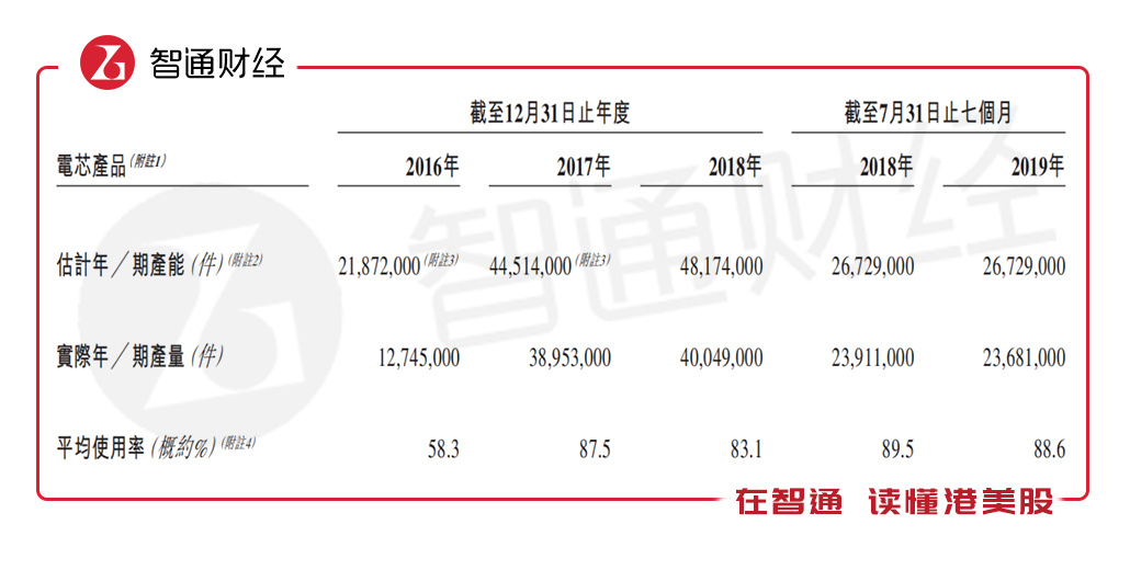 2016年为江西生产基地运营的第一年,彼时电芯产能2187.2万件,2017年产能翻1倍,但2018年产能仅提高8.22%,2019年首七个月则持平,从产能使用率上,2019年首七个月达到88.6%,与过去两年差距不大。由于2017年产能翻倍,该公司收入也翻番,2018年及2019年首7月,受产能及使用率牵制,收入增速明显放缓。