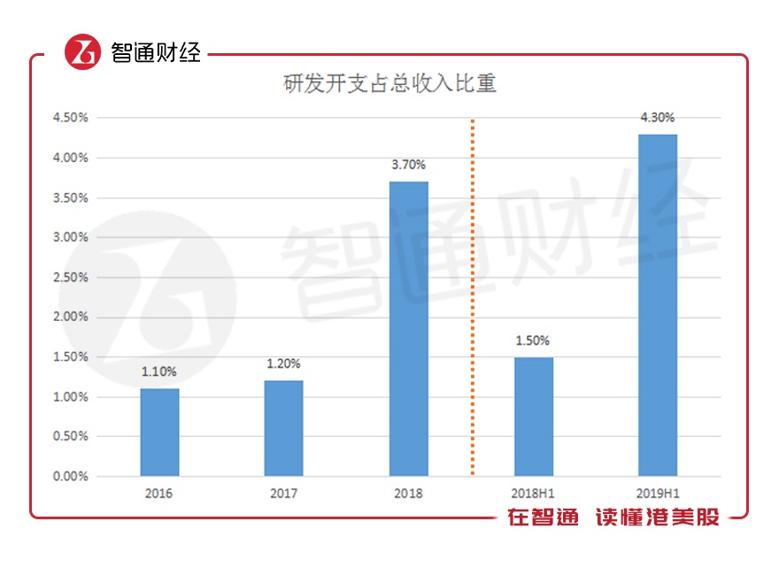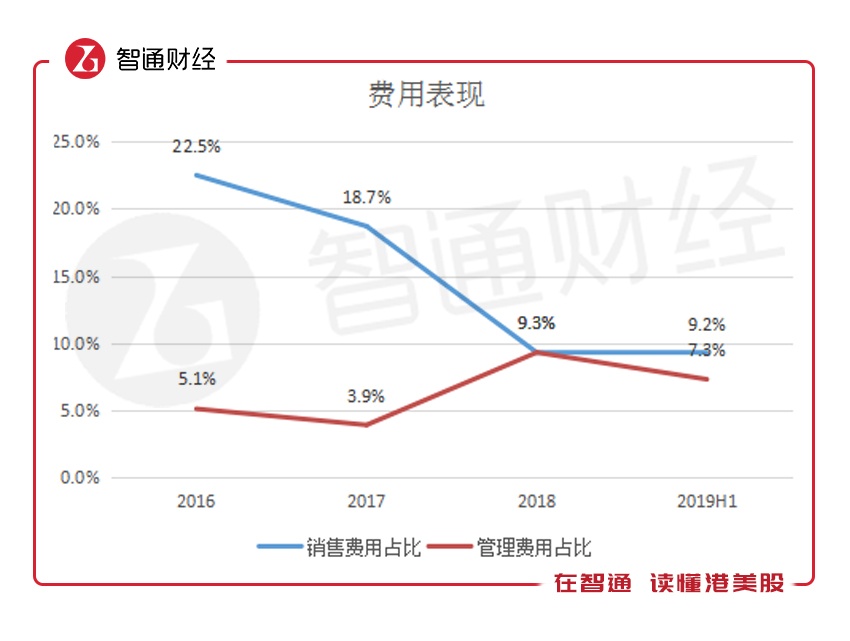 费用表现方面,公司销售、管理费用占收入比重也呈逐年下降趋势。其中,销售费用占收入比重由2016年的22.5%,大幅下降至了2019年中期的9.2%。