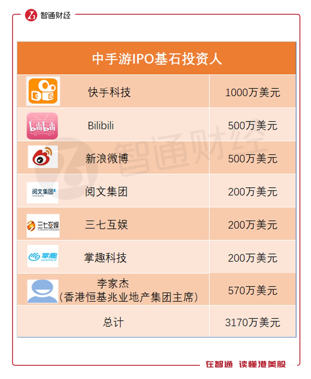 作为成立以来的第二次上市,中手游此次在香港的IPO也不乏诸多亮点。其中,基石投资者阵容可谓众星云集。据智通财经APP于从多处信源获悉,中手游此次共引入了7家基石投资者,包括快手科技、哔哩哔哩(BILI.US)、微博(WB.US)、阅文集团(00772)、三七互娱(002555)、掌趣科技(300315),以及恒基地产主席李家杰,共计投资额2.5亿港元。