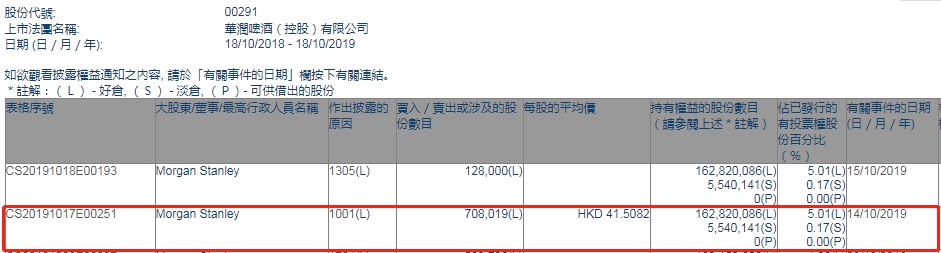 智通财经APP获悉,联交所最新资料显示,10月14日,摩根士丹利增持华润啤酒(00291)70.8019万股,每股作价41.5082港元,总金额约为2938.86万港元。增持后最新持股数目约为1.63亿股,最新持股比例为5.01%。