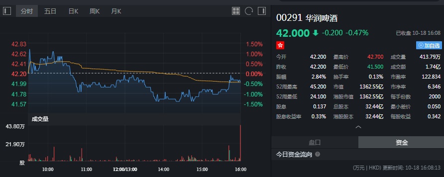 截至今日收盘,华润啤酒跌0.47%,报42.00港元。