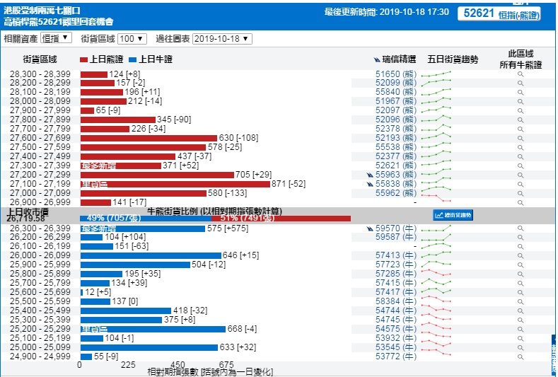 智通财经APP获悉,截至10月18日,恒指最新的牛熊街货比例49:51。瑞信恒指牛熊证街货分布图中的数据显示,熊证街货重货区在27100-27199区间,该区间最新熊证数量为871张,较上一交易日减少52张,最多新增在27300-27399区间,新增52张。牛证街货重货区在25200-25299区间,该区间最新牛证数量为668张,比上一交易日减少4张;最多新增在26300-26399区间,较上一交易日增加575张。