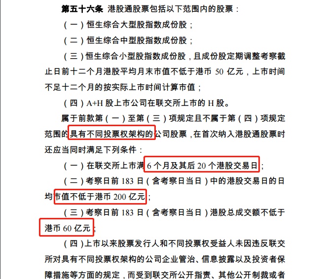 投资者需注意的是,在深交所发布的《深圳证券交易所深港通业务实施办法(2019年修订)》(10月28日生效)中明确,属于条款(一)至(三)、不属于条款(四)的具有不同投票权架构的公司股票,在首次纳入港股通时还需满足: