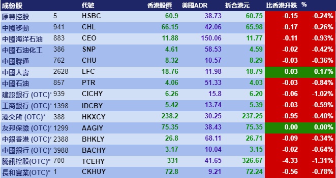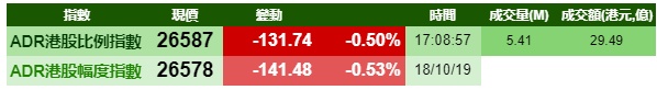 智通财经APP获悉,周五(10月18日)美股低开底走,三大股指小幅收跌。港股ADR指数下挫,按比例计算,收报26587点,跌131.74点或0.50%。汇丰控股收报60.75元,较港收市涨0.15元;腾讯控股收报326.67元,较港收市跌4.33元。