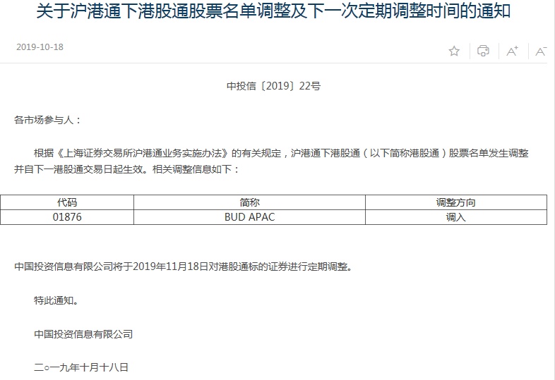中国投资信息有限公司预告,2019年11月18日将对港股通标的证券进行定期调整。