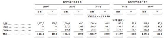 公司于2017年9月收购Shark Ninja,截止2019年6月30日止六个月,公司的主要收入来自于销售九阳厨房电器和Shark品牌电器的收入,分别占总收入的45.6%和36.4%