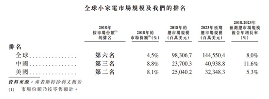 根据弗若斯特沙利文报告,以市场份额计,公司于2018年在全部小家电企业中排名全球第六,在以小家电为主的企业中排名第三,在中国及美国这两个最大的小家电市场亦拥有领先的市场地位。