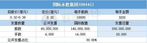 智通财经APP获悉,10月21日,国际永胜集团(08441)配售结束。配售招股价区间为0.32-0.39港元,最终定价0.32港元,每手3200港元。