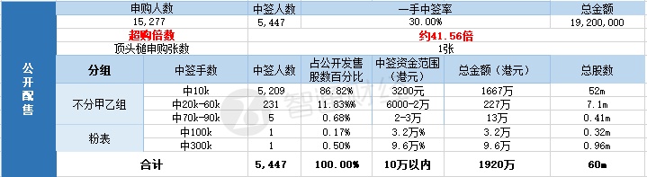 其中,公开配售申购人数15277,一手中签率30%,超购倍数41.56倍。