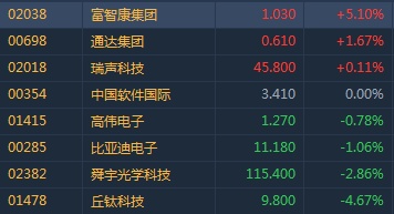 智通财经APP获悉,手机设备股走势分化,富智康集团(02038)涨超5%,丘钛科技(01478)挫逾4%。截至15时18分,富智康集团涨5.1%,报价1.03港元,瑞声科技(02018)涨0.11%,比亚迪电子(00285)跌1.06%,舜宇光学(02382)跌2.86%,丘钛科技(01478)跌4.67%。