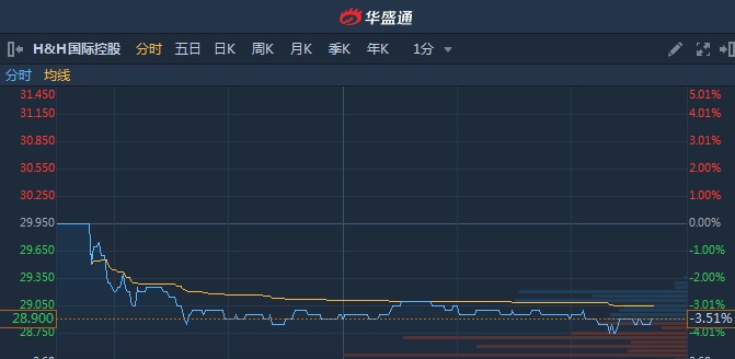智通财经APP获悉,H&H国际控股(01112)延续弱势,盘中低见28.75港元,创逾两年新高,截至15时42分,跌3.51%,报价28.9港元,成交额1691万。值得注意的是,近期该股港股通持股比例明显回落。