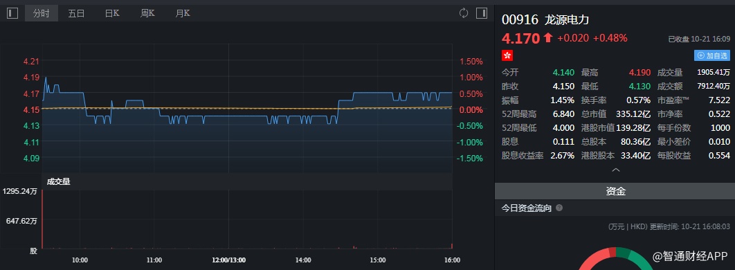 截至今日收盘,龙源电力(00916)涨0.48%,报4.17港元。
