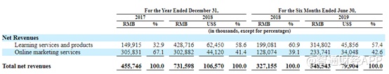 在线营销服务主要为不同形式的广告,如弹窗、链接、视频、流媒体等, 2017年和2018年以及截至2019年6月30日的六个月中,网易有道分别从基于效果的广告服务产生了在线营销服务净收入的84.4%,76.9%和82.3%,2019年上半年公司拥有月2200个广告客户。