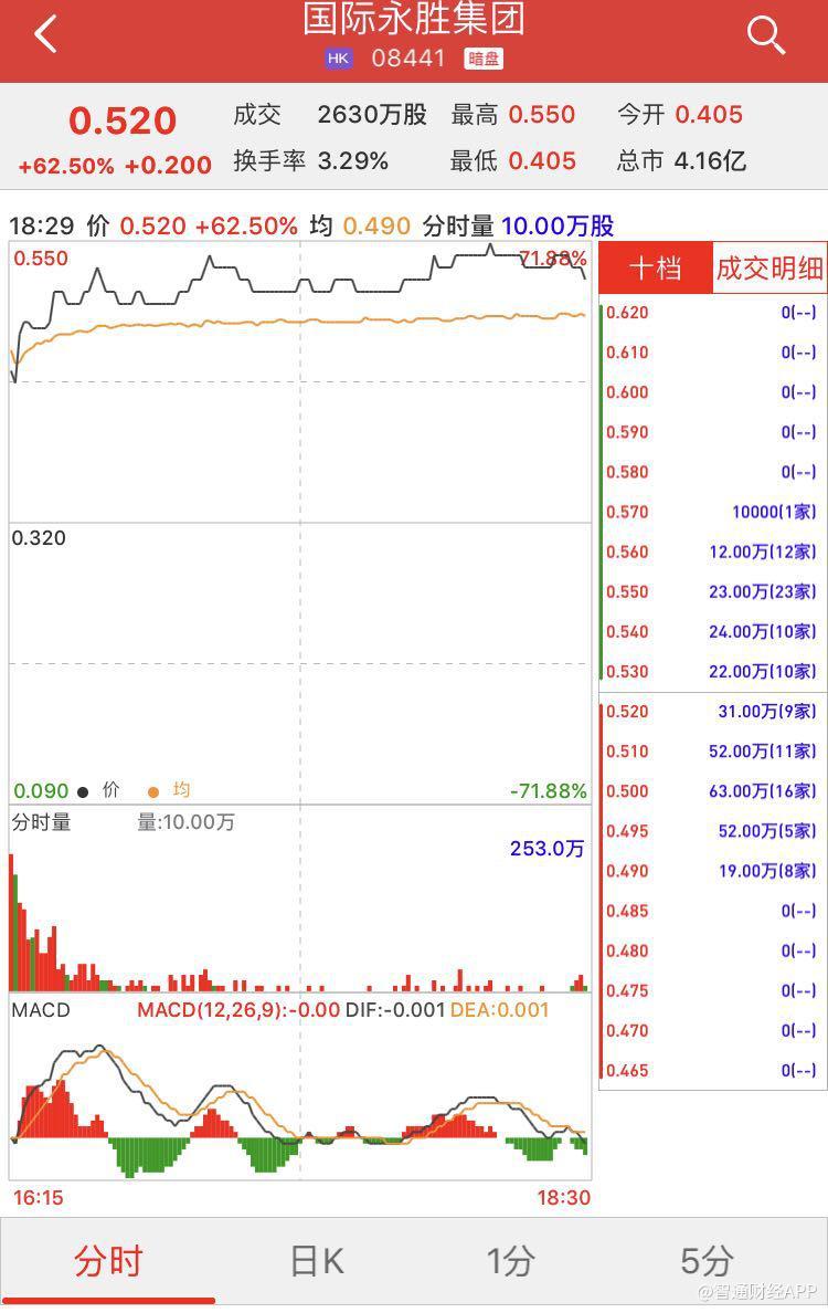另据利弗莫尔证券资料显示,暗盘收报0.52港元,较招股价涨62.5%。每手10000股,不计手续费,每手赚2000港元。