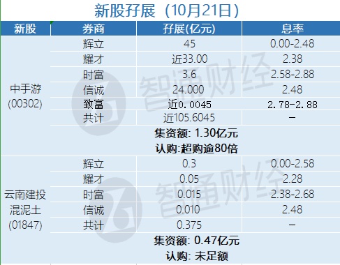 智通财经APP获悉,10月21日,中手游(00302)和云南建投混泥土(01847)正在招股中。