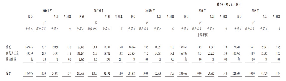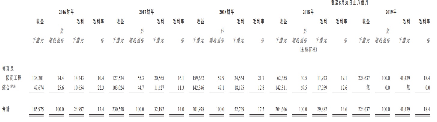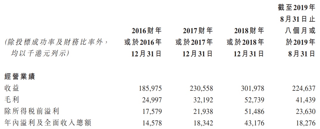 根据招股书中披露的财报,公司收益从2017财年的约230.6百万港元增加71.4百万港元或31.0%至2018财年的约302.0百万港元。由截至2018年8月31日止八个月的约204.7百万港元增加约20.0百万港元或9.8%至截至2019年8月31日止八个月的约224.6百万港元。