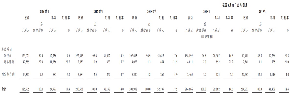对于该等以项目为单位的合约,公司主要担当分包商,或者于较小程度上担当总承建商。其中,分包商的营收占比不断提高,从2016财年的69.4%上升到2018财年的96.9%。