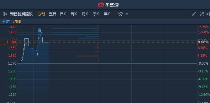 智通财经APP获悉,新昌创展控股(01781)附属取得汽车产品独家经销权,消息刺激股价大幅上扬,截至10时21分,涨8.66%,报价1.38港元,成交额991.9万。