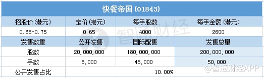 智通财经APP获悉,10月22日,快餐帝国(01843)配售结束。配售招股价区间为0.65-0.75港元,最终定价0.65港元,每手2600港元。