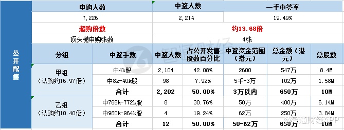 其中,公开配售申购人数7226,一手中签率19.49%,超购倍数约13.68倍。
