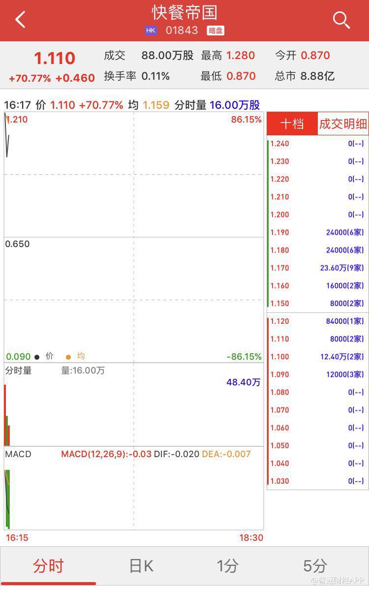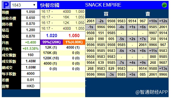 智通财经APP获悉,快餐帝国(01843)将于10月23日挂牌,今日(10月22日)暗盘开盘大涨,截止到发稿,辉立证券暗盘交易显示其报价1.05港元,较招股价0.65港元涨61.538%。每手4000股,不计手续费,每手赚1600港元。
