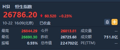 智通财经APP获悉,恒生指数开盘涨0.33%。指数全天窄幅震荡,尾盘涨幅收窄。截至收盘,恒生指数涨60.52点或0.23%,报26786.2点,全日成交额达751.84亿。国企指数跌0.16%,报10526.86点,红筹指数跌1.14%,报4288.51点。