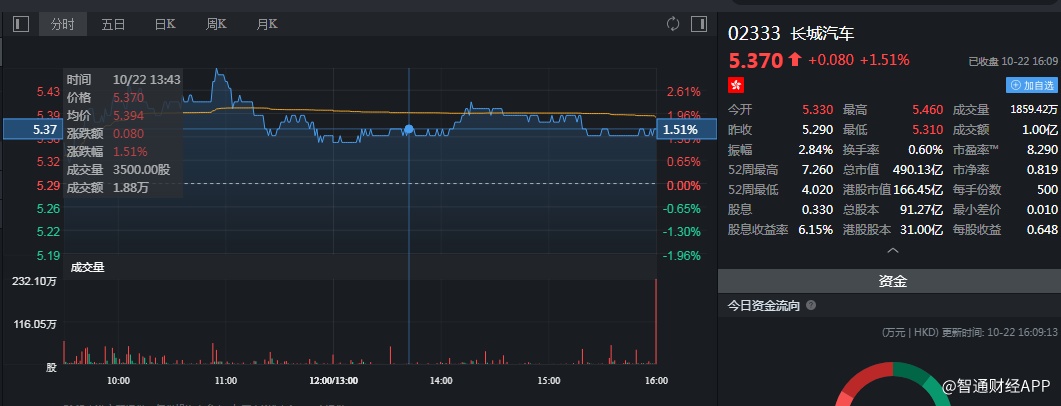 截至今日收盘,长城汽车(02333)涨1.51%,报5.37港元。