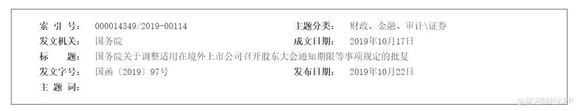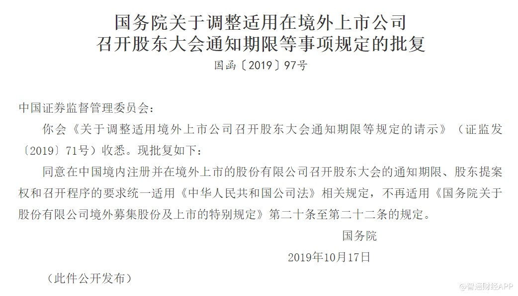 智通财经APP获悉,国务院今日发布关于调整适用在境外上市公司召开股东大会通知期限等事项规定的批复,同意在中国境内注册并在境外上市的股份有限公司召开股东大会的通知期限、股东提案权和召开程序的要求统一适用《中华人民共和国公司法》相关规定,不再适用《国务院关于股份有限公司境外募集股份及上市的特别规定》第二十条至第二十二条的规定。