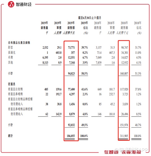 集团拥有两个主要业务分部,即自有产品生产及销售及推广密盖息,其中自有产品包括舒思、喜滴克、卓奥、松栀丸及其他药物,但是2019年上半年的自有产品销售全线“崩溃”。