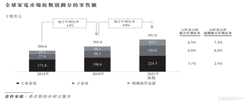 根据弗若斯特沙利文报告,按零售额计,全球小家电的市场规模从2014年的779亿美元增加到2018年的983亿美元,复合年增长率为6.0%,且预计到2023年达到1446亿美元,2018年至2023年的复合年增长率为8.0%。