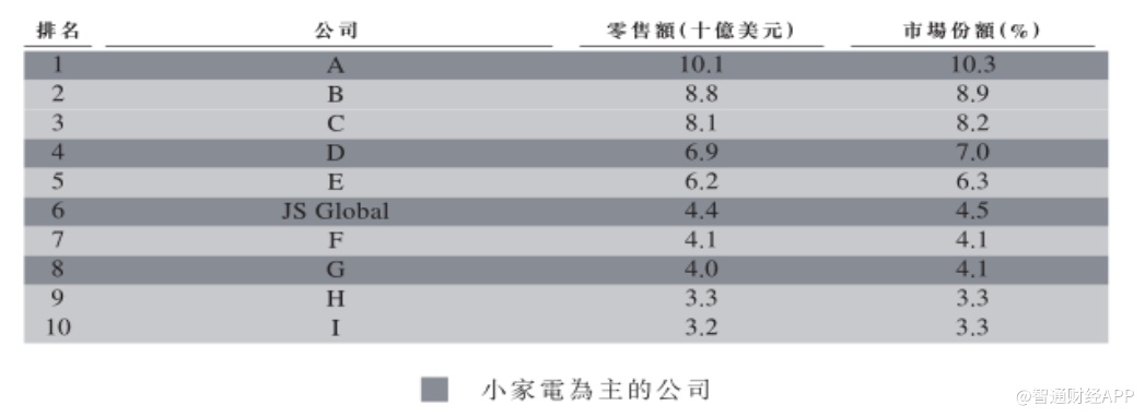 首先从全球小家电竞争格局来看,份额排名首位的公司市占率为10.3%,尚未形成具有绝对影响力的品牌,排名第六位的JS环球市占率仅为4.5%,较前几名仍有较大差距。