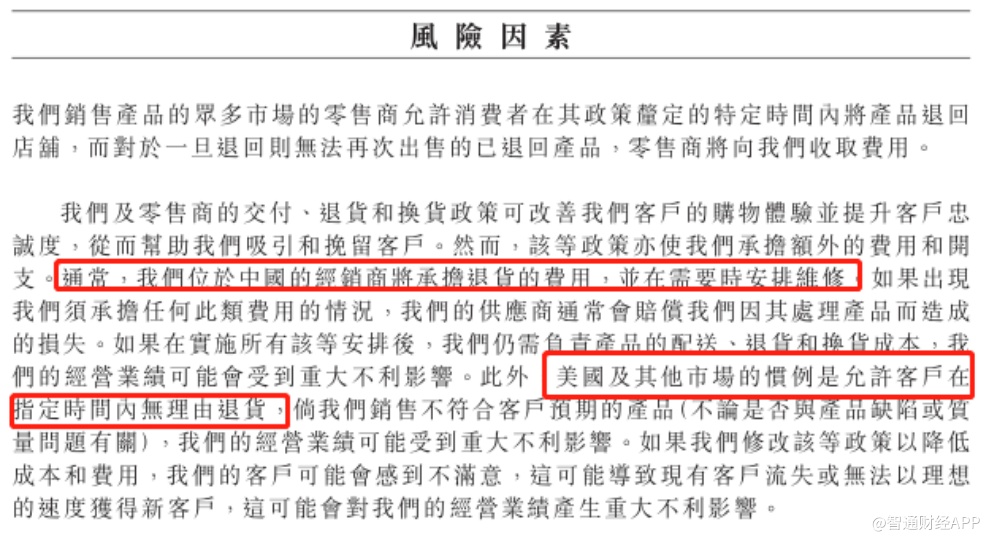 此外,美国及其他市场的惯例是允许客户在指定时间内无理由退货,倘公司销售不符合客户预期的产品(不论是否与产品缺陷或质量问题有关),公司的经营业绩可能受到重大不利影响。