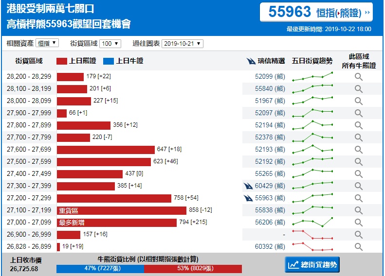 智通财经APP获悉,截至10月22日,恒指最新的牛熊街货比例47:53。瑞信恒指牛熊证街货分布图中的数据显示,熊证街货重货区在27100-27199区间,该区间最新熊证数量为858张,较上一交易日减少12张,最多新增在27000-27099区间,较上一交易日增加215张。牛证街货重货区在25200-25299区间,该区间最新牛证数量为661张,比上一交易日减少7张;最多新增在26400-26499区间,较上一交易日增加192张。