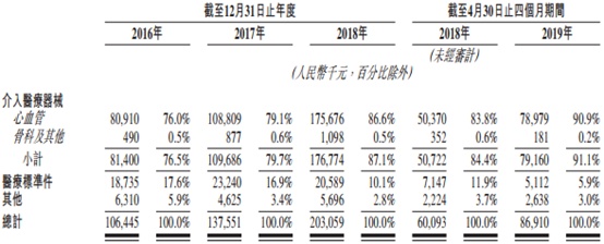 公司的绝大部分总收入来自销售公司的心内介入医疗器械。于2016年—2018年以及2018年及2019年前四个月,公司的介入医疗器械销售额分别占公司总收入的76.5%、79.7%、87.1%、84.4%及91.1%,而公司的医疗标准件销售额分别占公司总收入的17.6%、16.9%、10.1%、11.9%及5.9%。