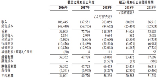 于2016年、2017年及2018年,公司的总收入分别为人民币106.4百万元、人民币137.6百万元及人民币203.1百万元,2016年至2018年的复合年增长率为38.1%,而公司的净利润分别为人民币34.0百万元、人民币40.8百万元及人民币58.2百万元,同期的复合年增长率为30.9%。于2018年及2019年前四个月,公司的总收入分别为人民币60.1百万元及人民币86.9百万元,而公司的净利润分别为人民币20.6百万元及人民币31.3百万元。于往绩记录期间,公司的总收入及净利润持续增长,主要由(其中包括)公司的市场份额及市场需求增加推动。