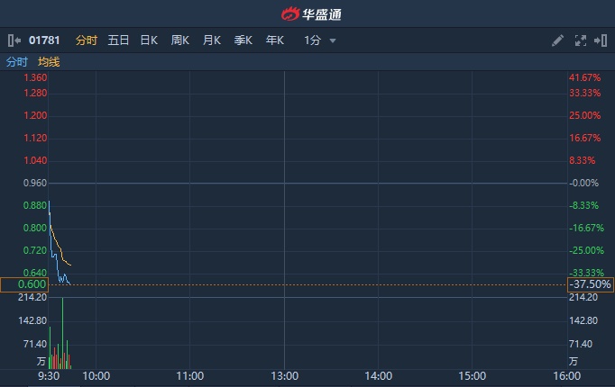 智通财经APP获悉,新昌创展控股(01781)早盘再度闪崩,盘中低见0.6港元,截至发稿,跌37.5%,报0.6港元,成交额569.88万港元。值得注意的是,该股昨日收跌23%。