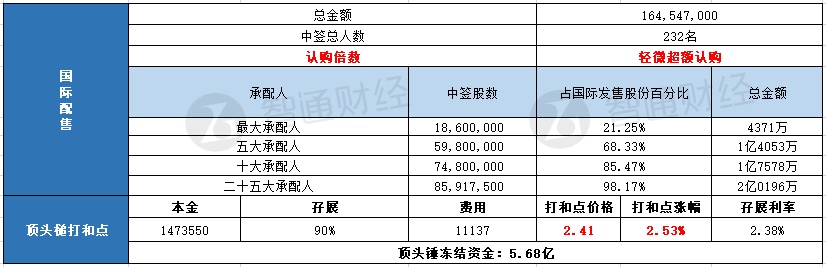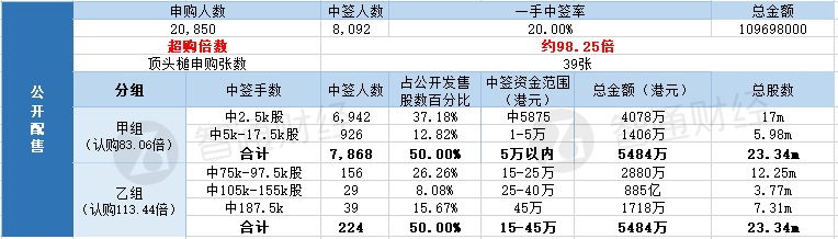 其中,公开配售申购人数为20850,一手中签率20%,认购倍数约98.25倍。