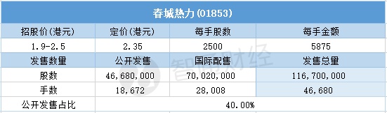 智通财经APP获悉,10月23日,春城热力(01853)配售结束。配售招股价区间为1.9-2.5港元,最终定价2.35港元,每手5875港元。