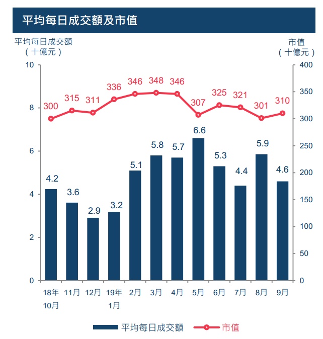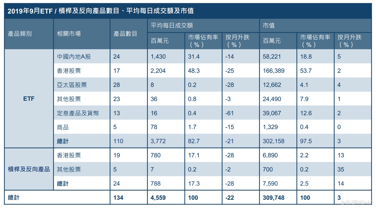 9月,香港股票ETF平均每日成交额22.04亿元,市场占有率48.3%,环比跌25%,市值达1663.89亿元;中国内地A股ETF平均每日成交额14.3亿元,市场占有率31.4%,环比跌14%,市值达582.21亿元。