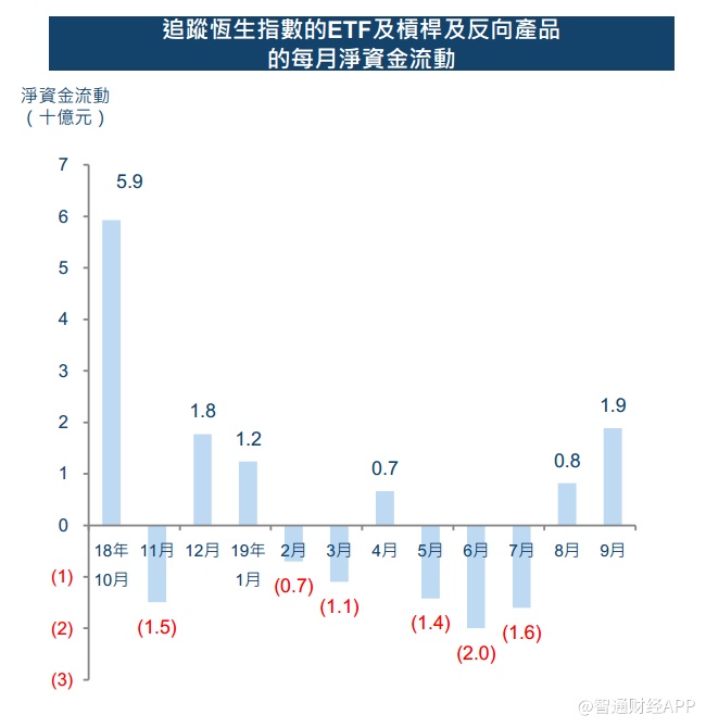 今年以来,追踪恒生指数的ETF和杠杆及反向产品仅有4个月份为资金净流入,9月净流入19亿元,而6月净流出最多,达20亿元。