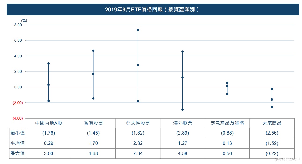 9月,亚太区股票ETF表现最佳,价格回报平均值达2.82%,最大值达7.34%;而其中又以日本及韩国股票ETF表现最佳。曾于8月份表现领先的黄金ETF则于9月份回落,主要因为金价在连升三个月后出现整固。大宗商品表现最差,价格回报平均值为-1.59%。