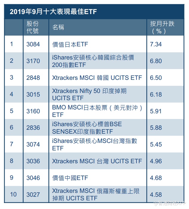 数据显示,于9月份表现最佳的三只ETF为:环比升7.34%的价值日本ETF(03084),追踪35家于东京证券交易所上市的日本企业;环比升6.8%的iShares安硕核心韩国综合股价200指数ETF(03170/09170/83170),追踪于韩国上市的200只最大型普通股;环比升6.5%的Xtrackers MSCI韩国UCITS ETF(02848),追踪韩国股市的大型及中型板块,涵盖韩国股市大概85%市值。