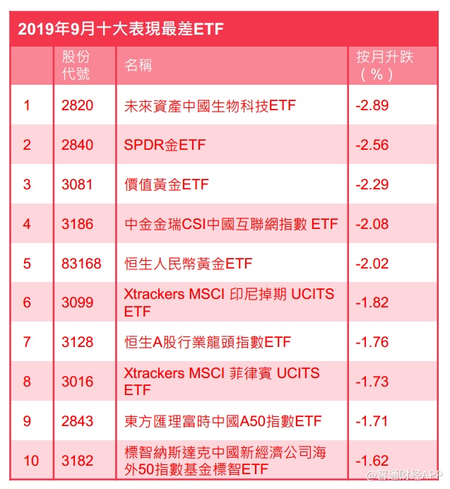 该月份表现最差ETF为未来资产中国生物科技ETF(02820),环比跌2.89%;紧随其后的是SPDR金ETF(02840),环比跌2.56%;表现最差第三名为价值黄金ETF(03081),环比跌2.29%。