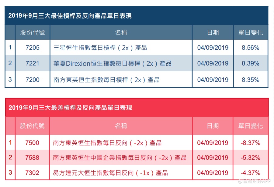 再看杠杆及反向产品,9月份单日表现最佳前三均涨逾8%,第一名是三星恒生指数每日杠杆(2x)产品(07205),于9月4日涨8.56%。而单日表现最差的是南方东英恒生指数每日反向(-2x)产品(07500),于9月4日跌8.37%。