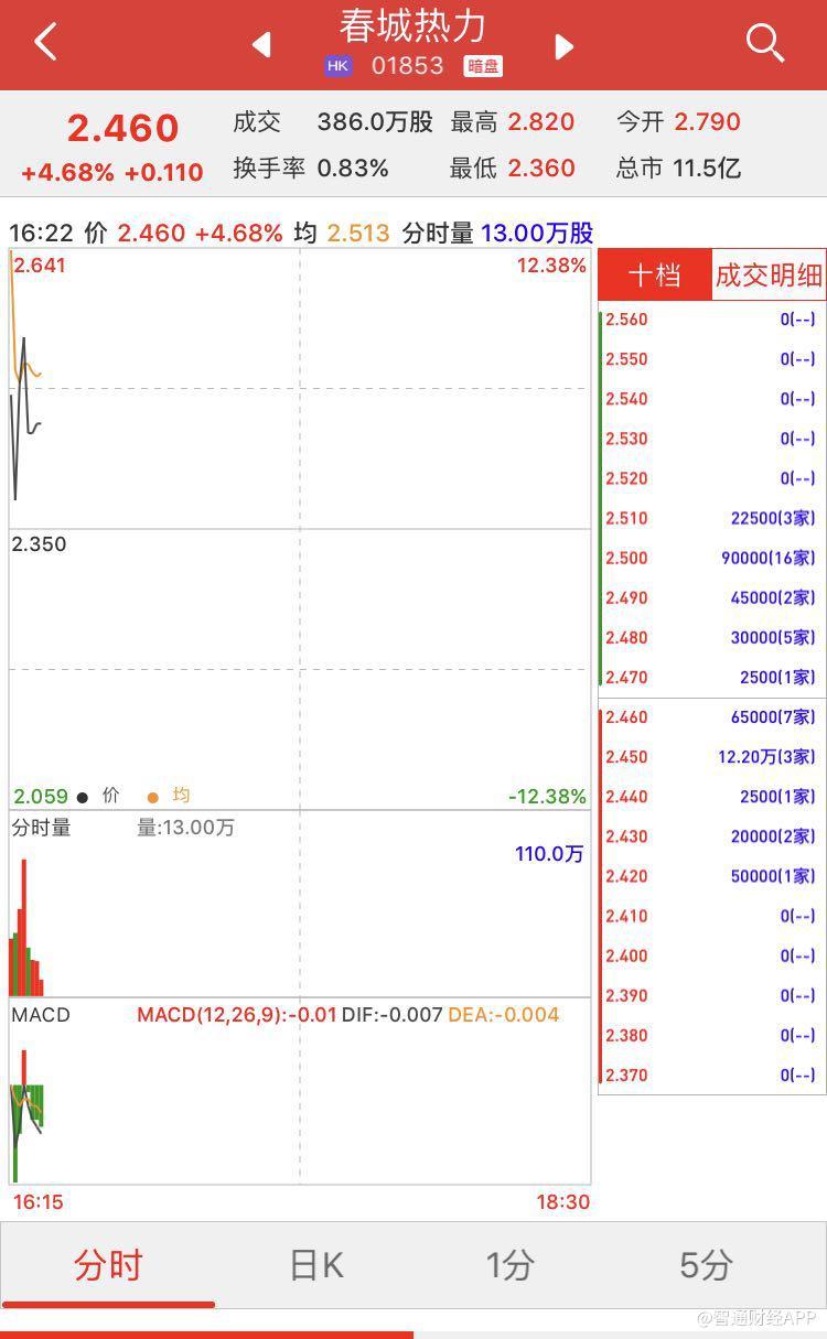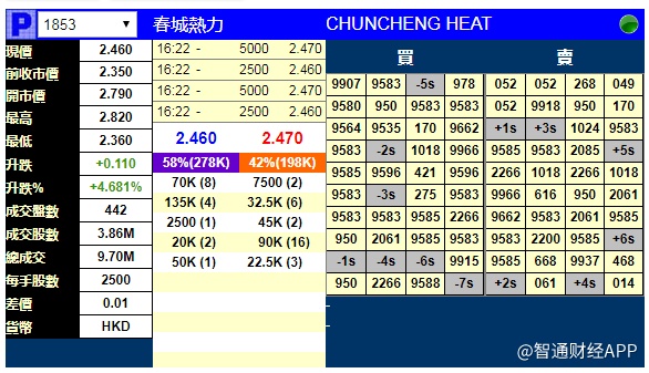 智通财经APP获悉,春城热力(01853)将于10月24日挂牌,今日(10月23日)暗盘开盘一度大涨逾12%,截止到发稿,辉立证券暗盘交易显示其报价2.46港元,较招股价2.35港元涨4.68%。每手2500股,不计手续费,每手赚275港元。