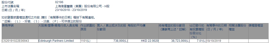 智通财经APP获悉,联交所最新资料显示,Ediburgh Partners Limited增持上海复星医药(02196)73.8万股,每股作价22.00港元,总金额约1628.6万港元。增持后持股数目为3872.3万股,持股比例为7.01%。