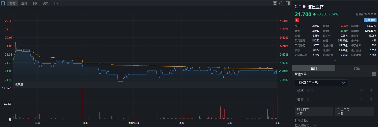 截止至10月23日收盘,复星医药跌1.14%,每股报价21.70港元。