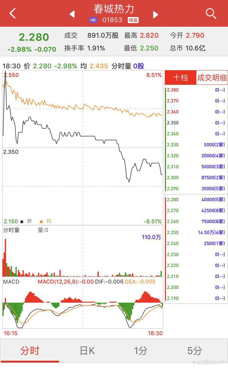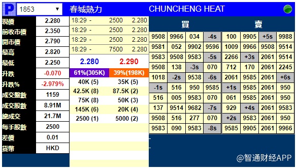 智通财经APP获悉,春城热力(01853)将于10月24日挂牌,上市前夕,辉立证券暗盘交易显示其收报2.28港元,较招股价2.35港元跌2.979%。每手2500股,不计手续费,每手亏175港元。