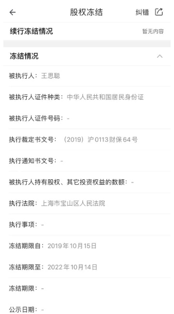 10月18日,天眼查数据显示,王思聪担任董事长的北京普斯投资有限公司股权被上海宝山区人民法院冻结,具体冻结数额不详,冻结期为3年,自2019年10月至2022年10月。