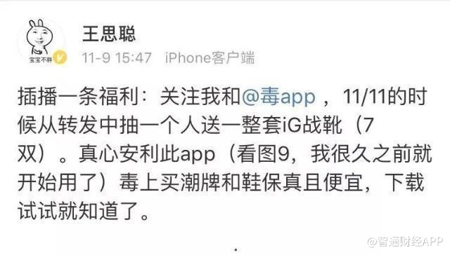 值得一提的是,去年IG夺冠之时,王思聪曾在微博推荐毒APP,并表示“毒上买潮牌和鞋子保真而且便宜”,在发布抽奖信息时,也要求关注毒APP。